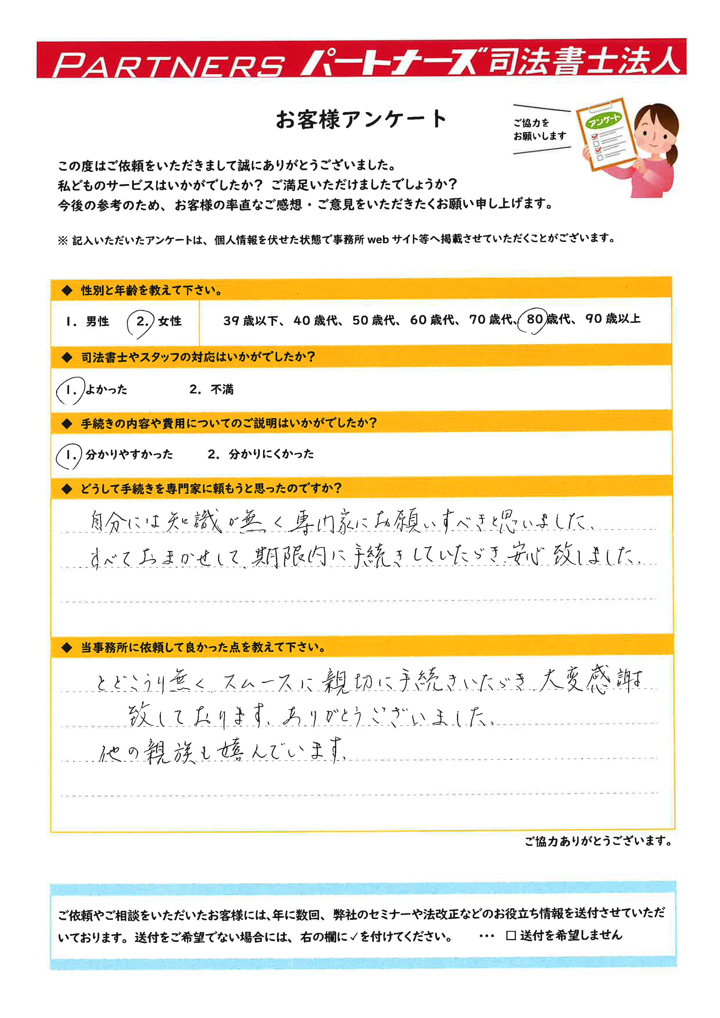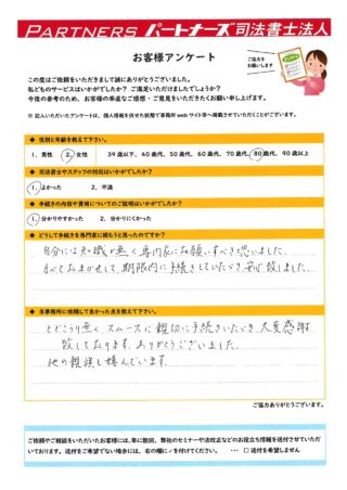 とどこうり無くスムーズに親切に手続きいただき大変感謝致しております。ありがとうございました。他の親族も嬉んでいます。