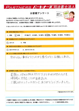 遺言書をもとに相続手続きを進める場合、特に内容の解釈や形式面について、法的な確認が必要となる場面があります。今回も、故人様の遺された文面が名義変更手続きに支障なく使用できるかについて、事前に法務局へ照会を行い、慎重に確認を進めました。その結果、手続きの入り口から名義変更完了まで、滞りなく進めることができました。